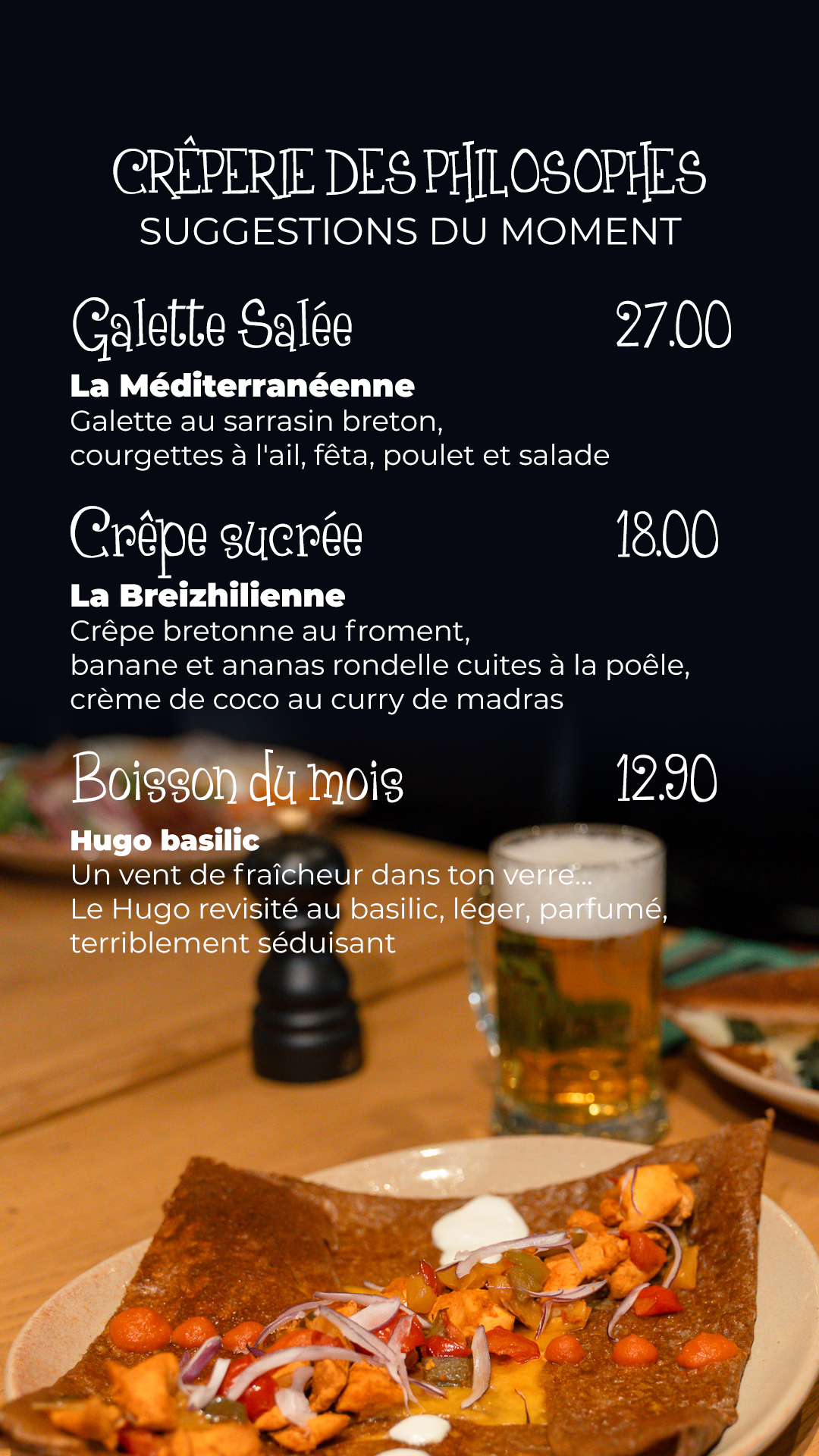 La crêperie des Philosophes vous propose l’intégralité de sa carte à l’emporter.