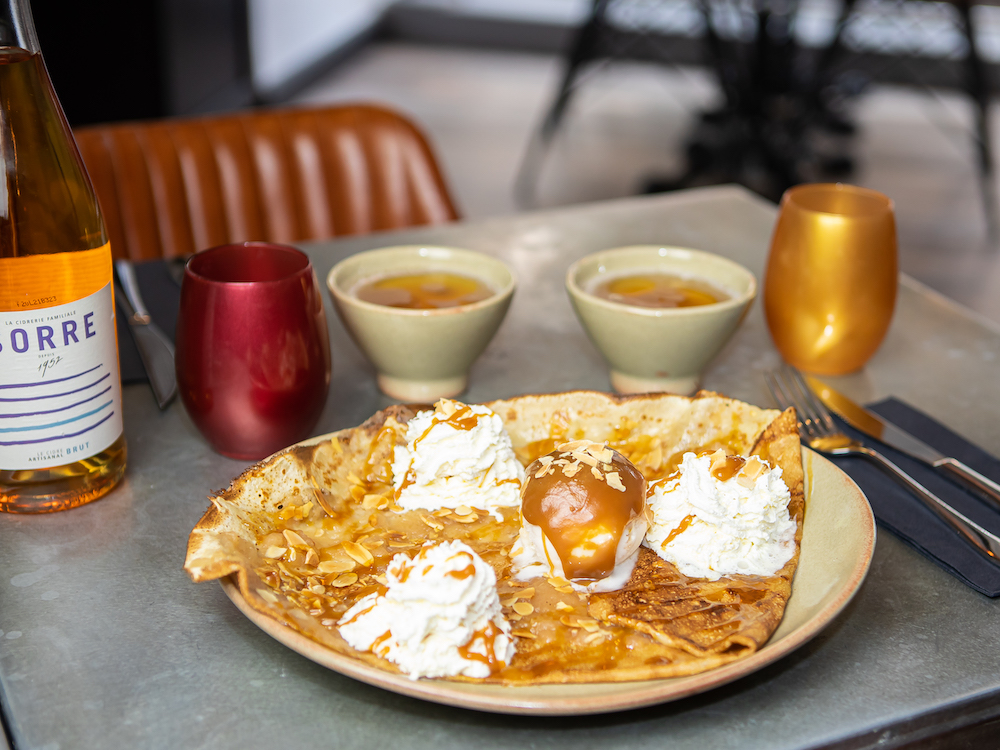Compote de pommes maison, boule de glace pomme, amandes grillées, crème chantilly, caramel au beurre salé