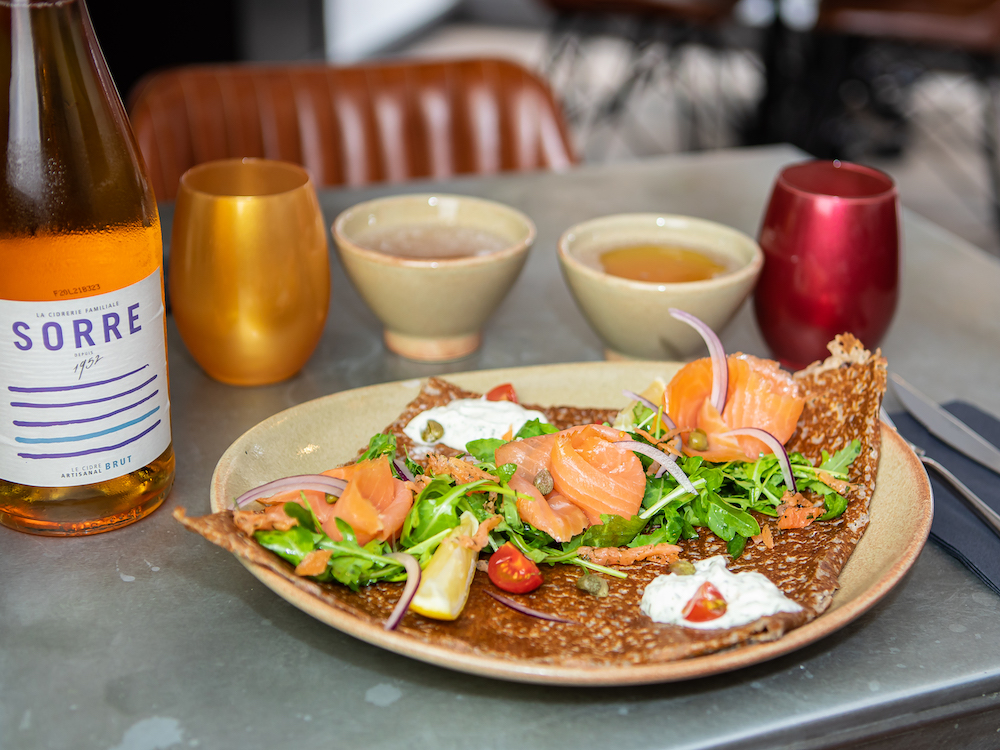 Saumon fumé, rucola, câpres, oignons rouges, crème acidulée à l’aneth